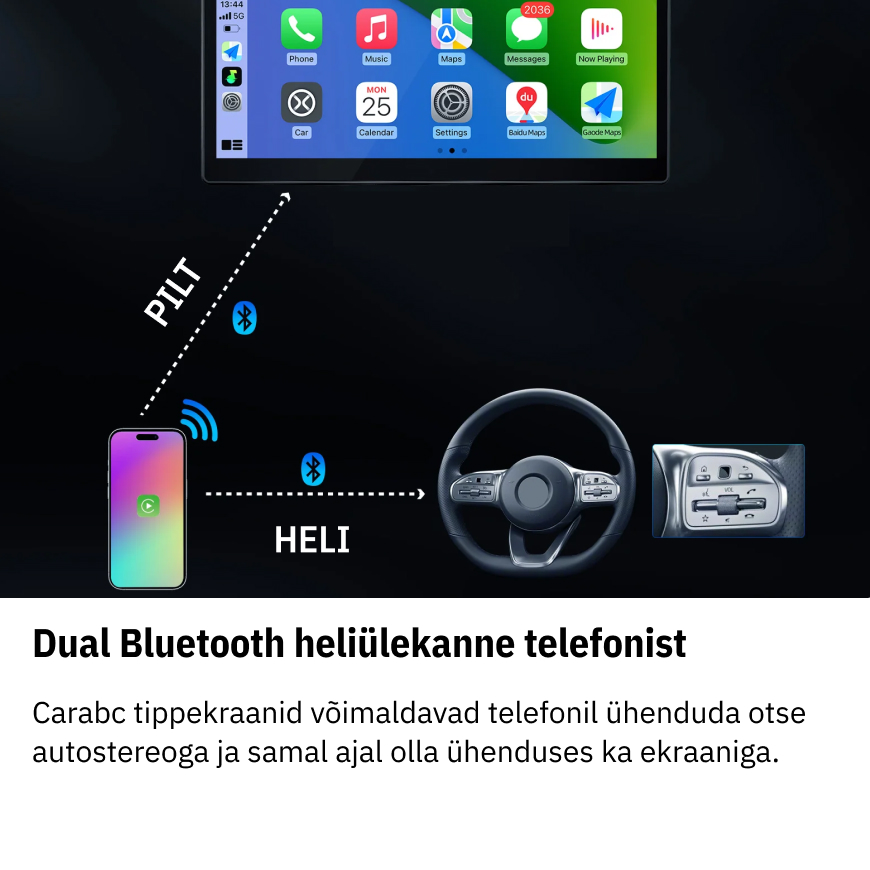 Jūsų automobilis turi charakterį, bet jam trūksta galios? Jokių problemų – šis aukštos kokybės, solidaus dizaino ekranas pavers jūsų automobilį visaverčiu skaitmeniniu piliečiu. CarPlay ir Android Auto montuojasi jūsų automobilyje be jokių laidų, prietaisų skydelio ar karštų klijų. Padedate ekraną į vietą, įjungiate į 12V lizdą, prijungiate telefoną – ir viskas: Spotify, Waze ir žinutės dideliame bei aiškiame ekrane. Tai tarsi naujo automobilio pojūtis, tik be lizingo įmokų.