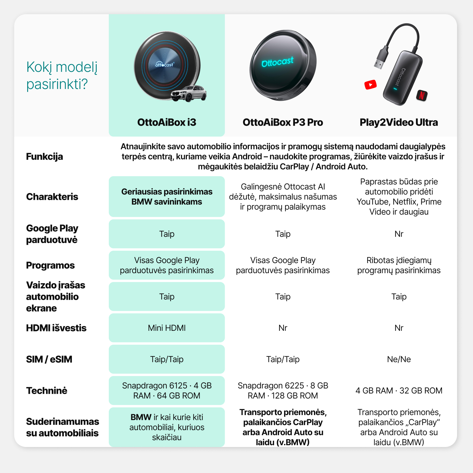 Ottocast OttoAibox i3 – tai Android 13 pagrįstas multimedijos centras, kuriame galima naudoti tokias programas kaip YouTube, Netflix, Spotify, Google Maps, Waze ir t.t. automobilio informacijos ir pramogų ekrane. Vaizdas automobilio ekrane rodomas per belaidę CarPlay sąsają. Įrenginys maitinamas iš automobilio USB lizdo.